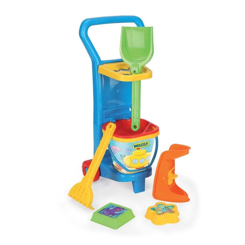 W jego skład wchodzi wózek na kółkach z pojemnikiem oraz łopatka, grabki, dwie foremki oraz młynek.