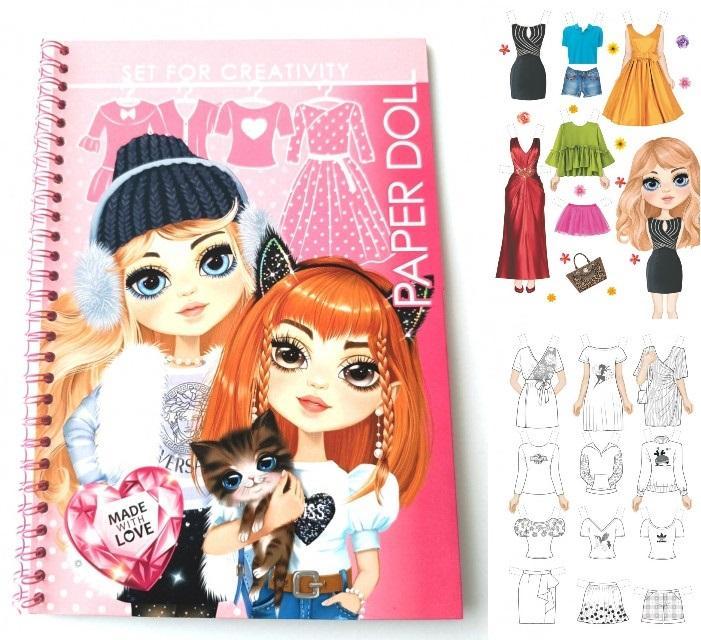 Papierowe lalki do zabawy. W środku znajdują się dwie modelki, które można ubrać w wycięte i pokolorowane przez siebie stroje. Wytnij je z książeczki, potem ubierz - zaginając specjalnie wystające kawałki papieru. Lalki i kostiumy mają wyraźne oznaczenia pokazujące, gdzie wyciąć, aby ubrania pasowały do lalek. Baw się nimi opowiadając najróżniejsze historie. Potem możesz przebrać lalkę i zacząć zabawę od nowa. Oprawa: spirala, wyprodukowano na Ukrainie.