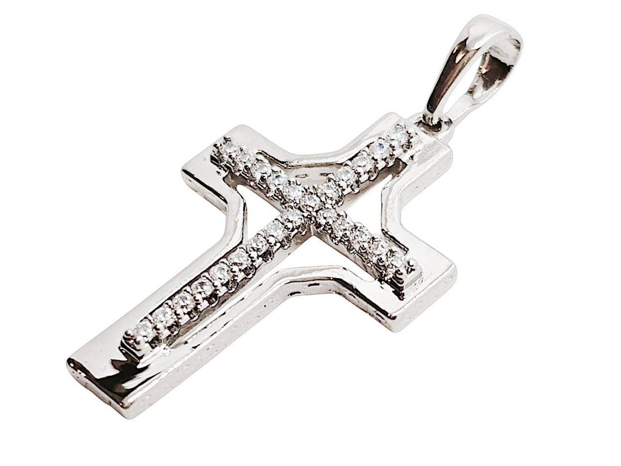 Głównym elementem zdobniczym jest linia lśniących cyrkonii, które biegną dokładnie przez środek krzyża, przecinając jego konstrukcję w pionie i poziomie. Ażurowe wycięcia wokół linii kamieni nadają całości lekkości i sprawiają, że biżuteria intryguje swoją trójwymiarowością. Chłodny, srebrzysty blask oprawy w połączeniu z krystaliczną czystością cyrkonii tworzy kompozycję pełną świeżości i elegancji.
