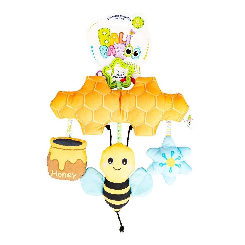 Wesoła zawieszka bawi, kryjąc w sobie wiele niespodzianek! Na plastrze miodu, wyposażonym w kryty dzwoneczek, buja się, zabawnie popiskując, uśmiechnięta pszczółka. Towarzyszy jej szeleszcząca beczułka miodu i piszczący kwiatek. Zabawka posiada praktyczną zawieszkę w kształcie gwiazdki, która umożliwia przymocowanie jej w dowolnym miejscu.