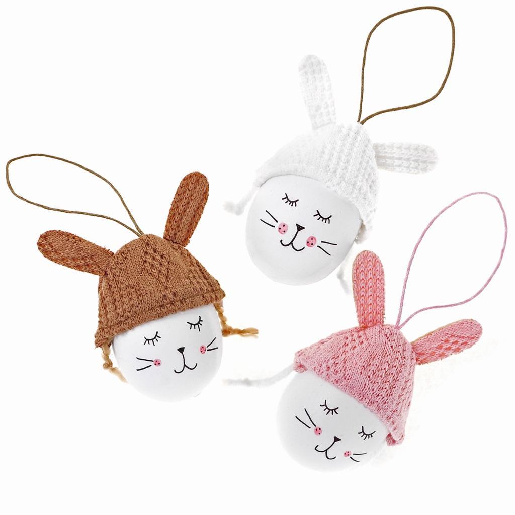 Zawieszki z pisankowymi zajączkami to uroczy element dekoracyjny oraz dodatek do wielkanocnych projektów kreatywnych. W komplecie znajdziesz trzy białe jajka z namalwowanymi, zajączkowymi pyszczkami , do których przymocowane zostały dzianinowe czapeczki w trzech kolorach: brązowym, białym i pastelowo różowym. Każda pisanka oprócz zawieszki posiada na dole dziurkę o średnicy ok. 0,5 cm dzięki czemu możesz wykorzystać ją również jako ozdobę na piku.