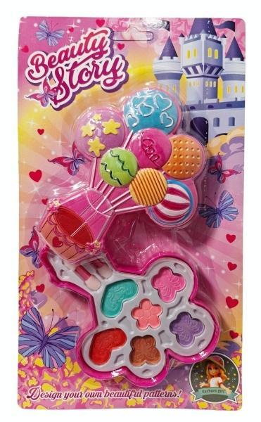 Paletka kosmetyków do makijażu w kształcie baloników. Zawiera 6 odcieni cieni do powiek. Produkt przeznaczony dla dzieci od 5 lat. Zabawka zapakowana w kartonową podstawkę z przezroczystym kloszem. Podane wymiary są wymiarami opakowania.