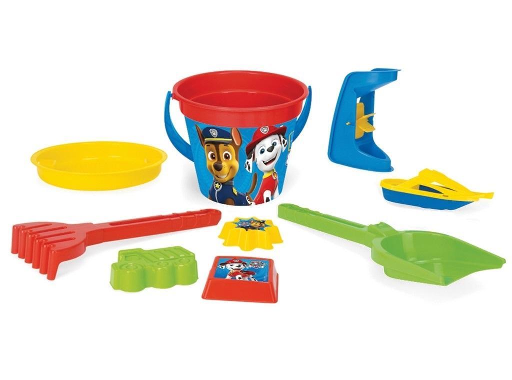 Komplet do piasku z motywem z bajki Paw Patrol, składający się z 9 elementów w tradycyjnych kolorach spodoba się wszystkim miłośnikom twórczej zabawy w piasku. W skład zestawu wchodzą: okrągłe wiaderko, łopatka, grabki, sitko, młynek 3 foremki i motorówka. Poszczególne elementy posiadają ciekawą grafikę wykonaną metodą IML. Dzięki temu wytrzyma ona kontakt z wodą i słońcem. Całość wyprodukowana z nietoksycznych, bezpiecznych i wytrzymałych materiałów.