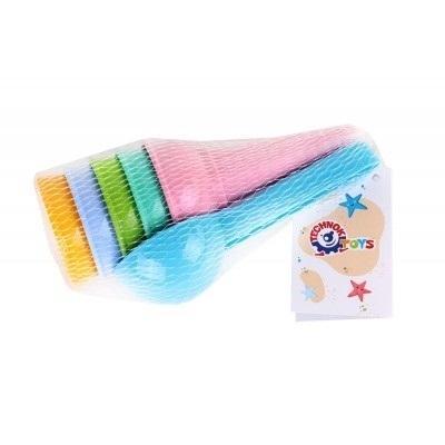 W skład "Zestawu do zabawy z piaskiem" wchodzi 5 foremek w formie "lodowego rożka" oraz łyżka do robienia gałek lodów. Zabawka wykonana jest z wysokiej jakości i bezpiecznego, bezwonnego tworzywa sztucznego.