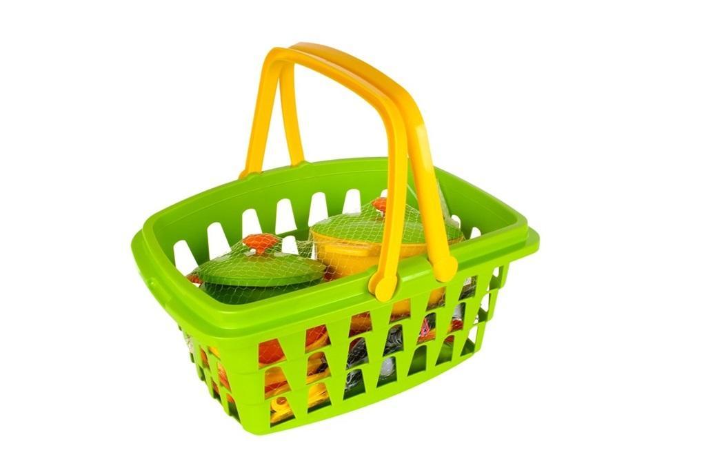 Wszystkie elementy zestawu wykonane są z mocnego, wysokiej jakości, bezwonnego tworzywa sztucznego, bezpiecznego dla dzieci. W skład zestawu wchodzą : kosz, 2 garnki z pokrywką, rondel z pokrywką, patelnia, łopatka, duży widelec, chochla, skimmer, dzbanek z pokrywką, 4 talerze z przyborami.