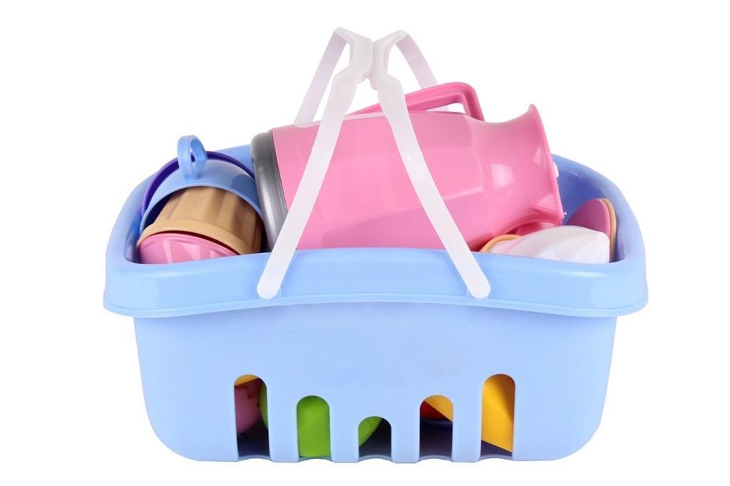 W zestawie: kosz, dzbanek z pokrywką, 4 filiżanki ze spodeczkami i łyżeczkami, 2 talerze, 4 różne foremki w postaci "babeczek ze śmietaną", winogrona, jabłko, gruszka, banan, 2 truskawki .