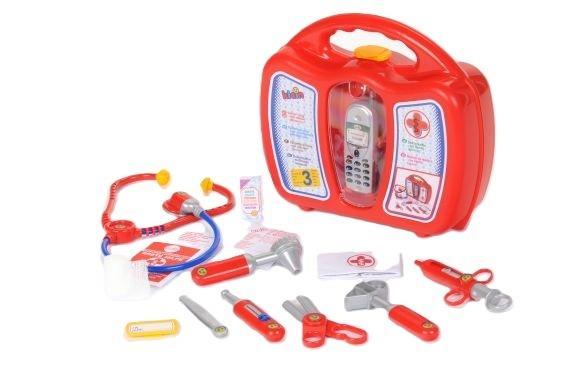 Zestaw z komórką jest jednym z najbardziej okazałych z całej serii lekarskiej. Zawiera on kompletne i niezbędne wyposażenie każdego medyka. Czerwona walizeczka wykonana jest z bardzo trwałego tworzywa, posiada wygodny uchwyt do noszenia oraz żółty klips, który zabezpiecza ją przed otwieraniem się. Z przodu pod transparentną pokrywą znajduje się zabawkowy telefon komórkowy, który musi zawsze być pod ręką. Ten zestaw zawiera aż 14 elementów. Wszystkie elementy są oczywiście bezpieczne dla dzieci i proste w użyciu. W walizeczce znajdują się czerwono-niebieski plastikowy stetoskop, zabawkowy telefon komórkowy (wymagane użycie baterii, których brak jest w zestawie), strzykawka, termometr, nożyczki, otoskop, młoteczek, plaster, identyfikator, opaska pielęgniarska, pudełeczko na watę opatrunkową, recepta, karta pomiarów medycznych. Seria zestawów i akcesoriów lekarskich z jednej strony służy zabawie w doktora czy pielęgniarkę, a z drugiej strony pomaga dzieciom oswoić się z tematem wizyty u lekarza, wykonywanych badań i zabiegów. Mamy tutaj szeroki wybór zestawów z większą lub mniejszą ilością akcesoriów oraz szereg pojedynczych produktów jak np. fartuchy lekarskie czy stetoskopy. Cała seria wizualnie stworzona jest tak, aby mogli się nią bawić zarówno chłopcy jak i dziewczynki.
