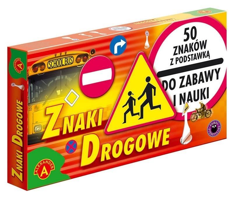 50 znaków drogowych, 50 podstawek plastikowych, opis znaczenia znaków.