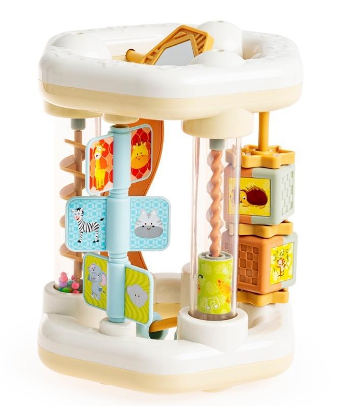 Stylowa zabawka w pięknych, pastelowych kolorach, w której tak wiele się dzieje! Na małe rączki czekają obrazki zwierzątek do obracania i kwiatek do przesuwania, a także koraliki, które po przekręceniu rolera do góry nogami, przesypią się, wydając przy tym wesoły, grzechoczący dźwięk. Znajduje się tu też obrotowe lustereczko do samopoznania malucha. Klocki umieszczone na ściance zabawki posiadają fakturowaną powierzchnię, przez co, podczas zabawy, stymulować będą zmysł dotyku malucha.